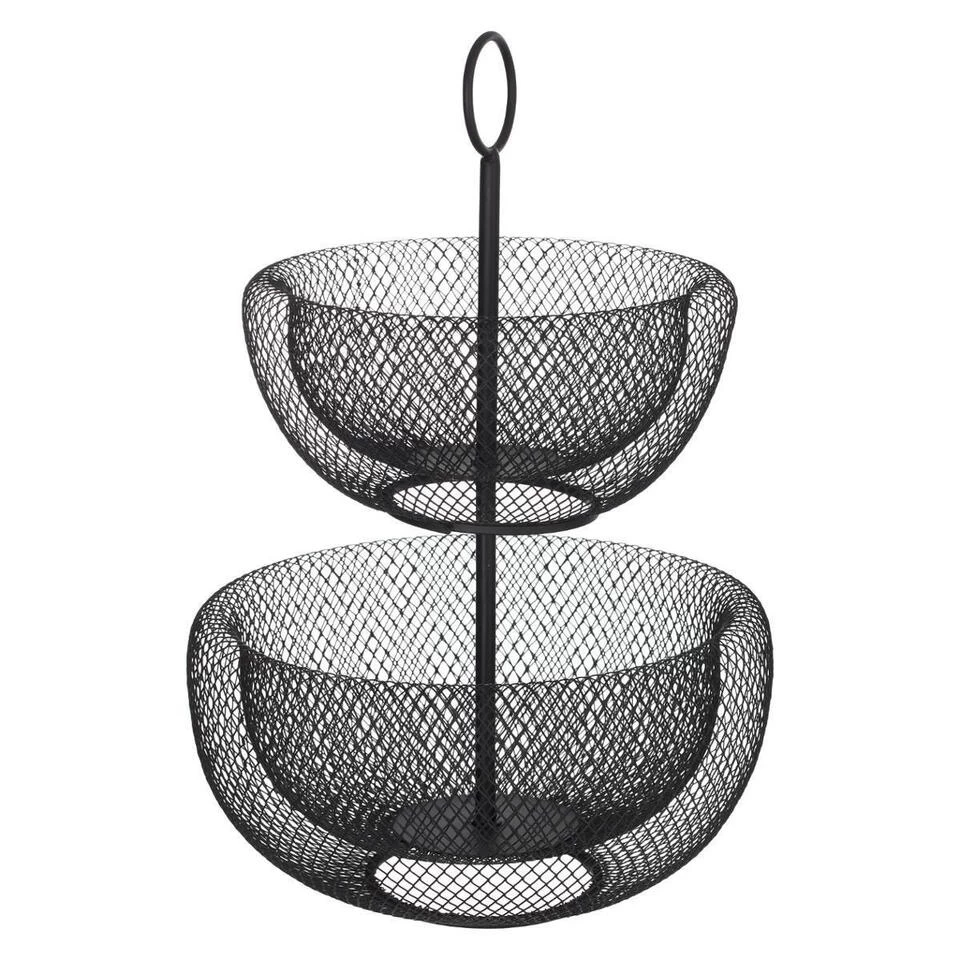 Dubbele etagere fruitschaal/fruitmand rond zwart metaal 29 x 38 cm. De opengewerkte schaal zorgt voor een constante luchtcirculatie waardoor het fruit minder snel overrijp is. Afmeting: ca. D29 x H38 cm. Reinigen: afnemen met een vochtige doek. Fruitschalen/fruitmanden/draadmanden.