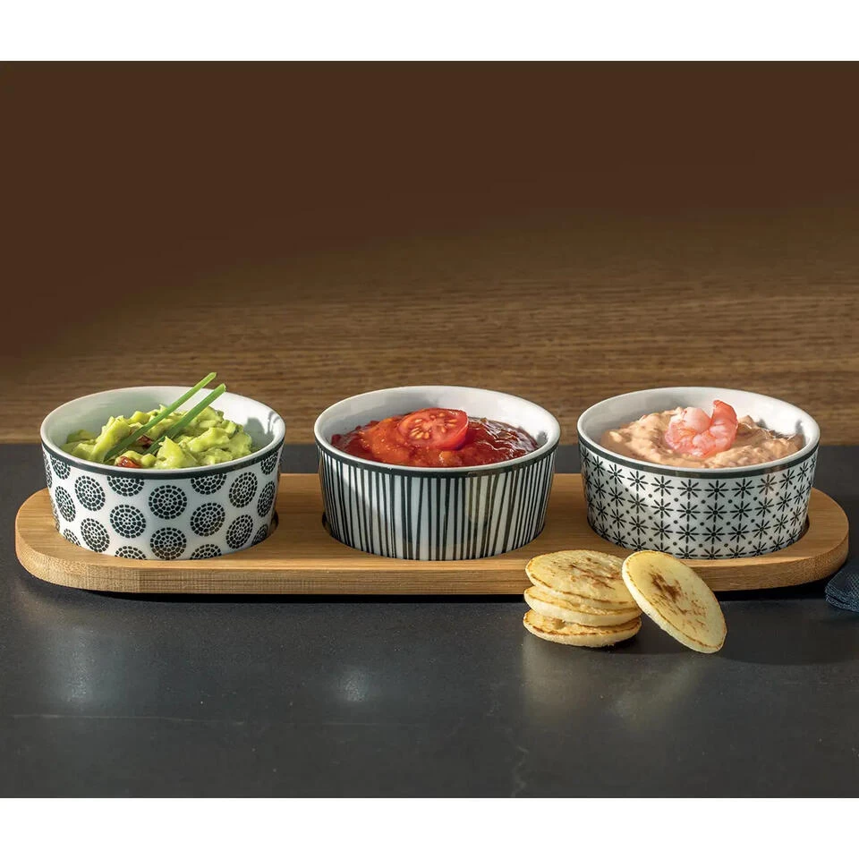 Serveerplank/borrelplank voor hapjes/saus/tapas aardewerk wit met zwarte gevlekt inclusief 3x schaaltjes. Serveer je gerechten met deze mooie set tijdens diner of borrel. Afmeting: ca. L29.8 x B10 x H4.5 cm. Afmeting schaaltjes: ca. D8.6 x H3.9 cm. Materiaal: aardewerk/bamboe. Het aardewerk is vaatwasser bestendig. Merk: 5Five. Snack- en tapasschalen. Etenswaren bakjes, kommetjes, kleine schaaltjes.