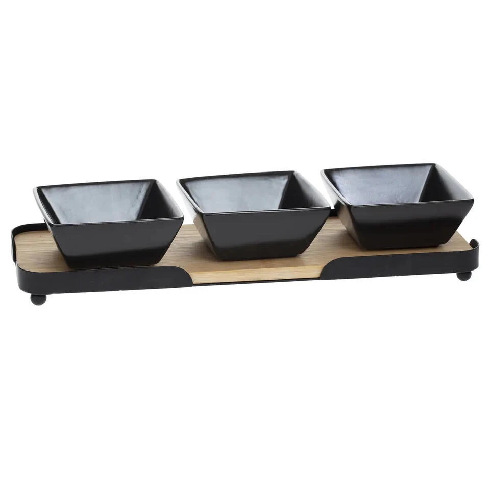 Serveerplank/borrelplank voor hapjes/saus/tapas aardewerk zwart inclusief 3x schaaltjes. Serveer je gerechten met deze mooie set tijdens diner of borrel. Afmeting: ca. L31 x B10 x H6 cm. Afmeting schaaltjes: ca. 9 x 9 x 3,5 cm. Materiaal: aardewerk/bamboe/ijzer. Het aardewerk is vaatwasser bestendig. Merk: 5Five. Snack- en tapasschalen. Etenswaren bakjes, kommetjes, kleine schaaltjes.