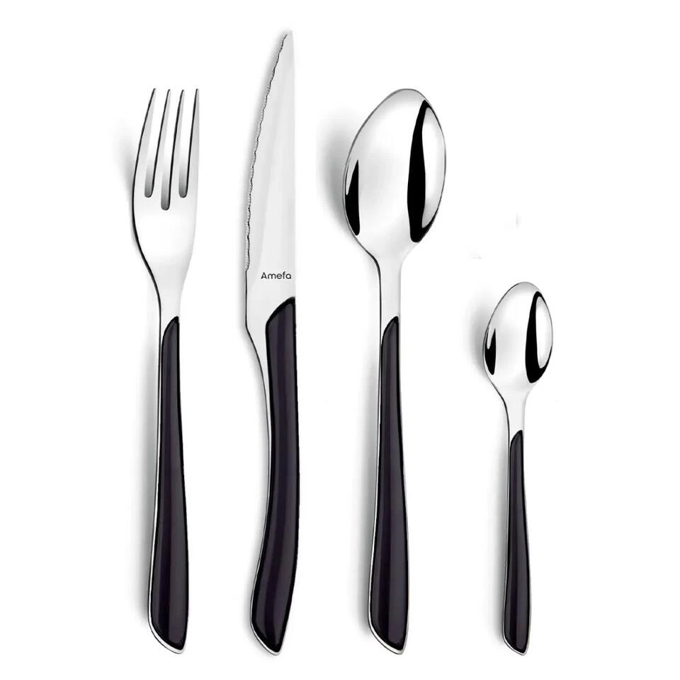 Elke gedekte tafel ziet er nog mooier uit met deze Eclat bestekset van Amefa. Deze moderne set bestaat uit 24 18/0 roestvrijstalen onderdelen: 6 tafelmessen, 6 tafelvorken, 6 tafellepels en 6 middelgrote theelepels, elk met een kleurrijk handvat. Bovendien is deze set vaatwasmachinebestendig en het gebruikte chroomnikkelstaal biedt een hoge corrosieweerstand en een diepe spiegelafwerking. Amefa bestek is een prachtige aanvulling op elke eetgelegenheid en is de ideale, levendige combinatie met ander bestek.