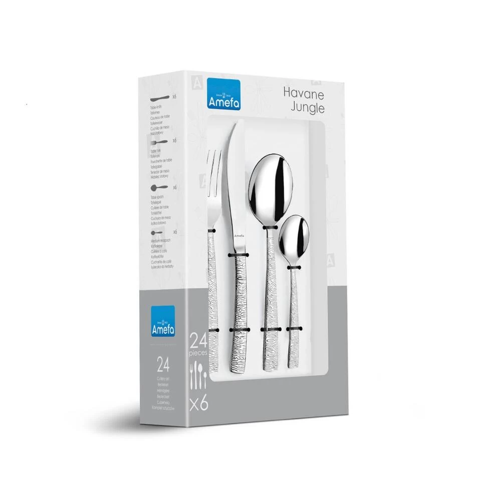Elke gedekte tafel ziet er nog mooier uit met deze Havane Jungle bestekset van Amefa. Deze eigentijdse bestekset bestaat uit 24 roestvrijstalen onderdelen: 6 tafelmessen, 6 tafelvorken, 6 eetlepels en 6 medium theelepels, elk met een licht gebogen handvat. Bovendien is elke Amefa set vaatwasmachinebestendig en biedt het gebruikte roestvrij staal een hoge corrosieweerstand. Amefa bestek is een prachtige aanvulling op elke eetgelegenheid en is de ideale combinatie met ander bestek.