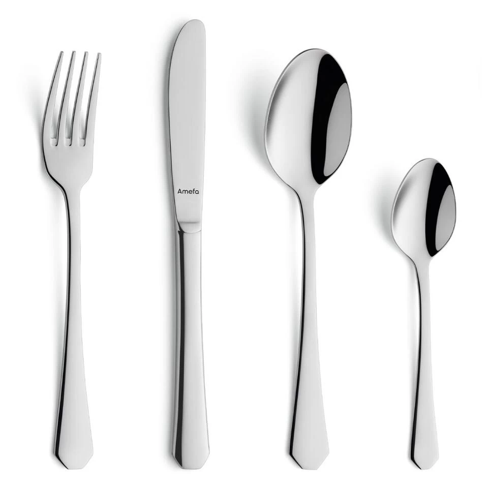 Elke gedekte tafel ziet er nog mooier uit met deze Hexa bestekset van Amefa. Deze eigentijdse bestekset bestaat uit 24 roestvrijstalen onderdelen: 6 tafelmessen, 6 tafelvorken, 6 eetlepels en 6 medium theelepels. De geometrische lijnen van deze bestekset zorgen voor een karakteristieke uitstraling. Elke Amefa set is vaatwasmachinebestendig en het roestvrij staal biedt een hoge corrosieweerstand. Amefa bestek is een prachtige aanvulling op elke eetgelegenheid en is de ideale combinatie met ander bestek.