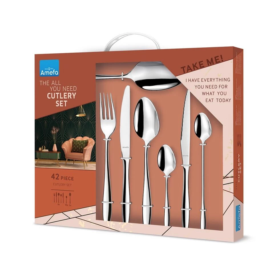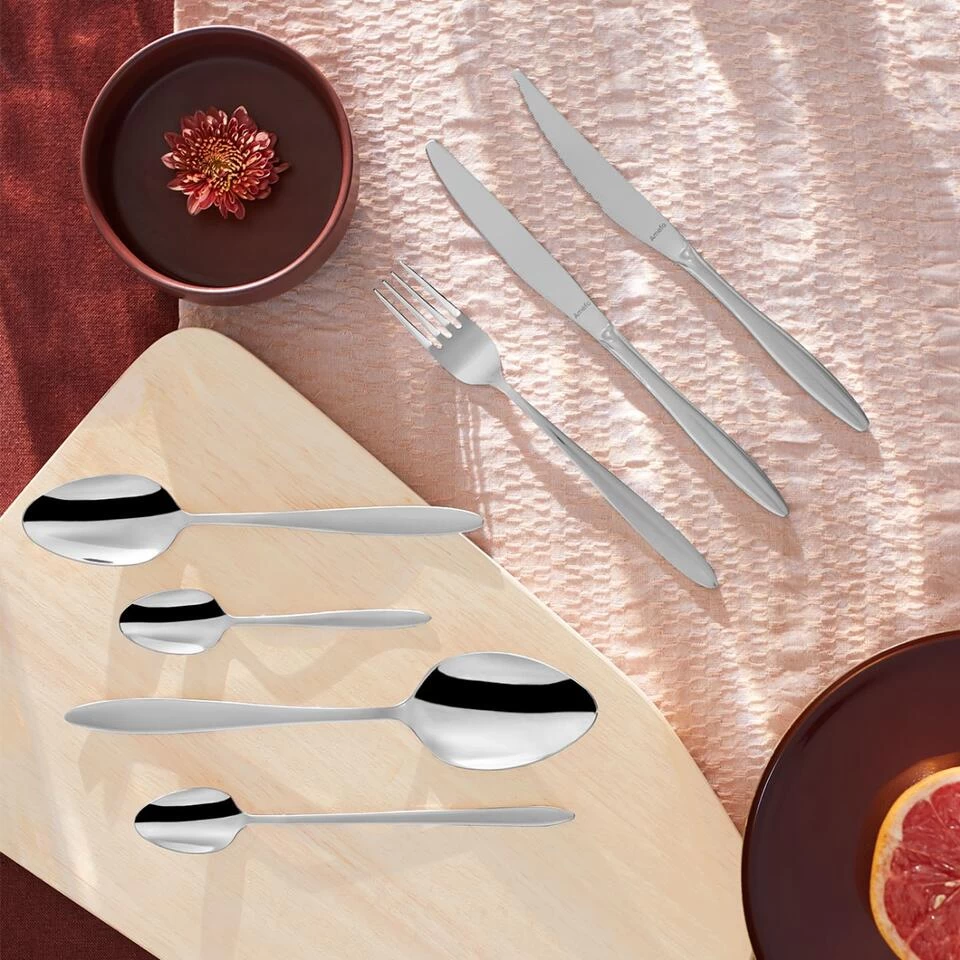 Hoe je maaltijd er ook uit ziet – vroeg in de ochtend of laat op de avond, zelfgemaakt of zelf besteld, snelle hap of uitgebreid tafelen – deze bestekset bevat alles wat je nodig hebt voor 6 personen. Naast het gebruikelijke mes, vork en lepel haal je met deze set ook meteen bijpassende steak-/pizzamessen, ijs-/latte lepels, koffielepeltjes en serveerlepels in huis. Dus hoe of wat je ook eet, deze bestekset is “All You Need” en bestaat uit: