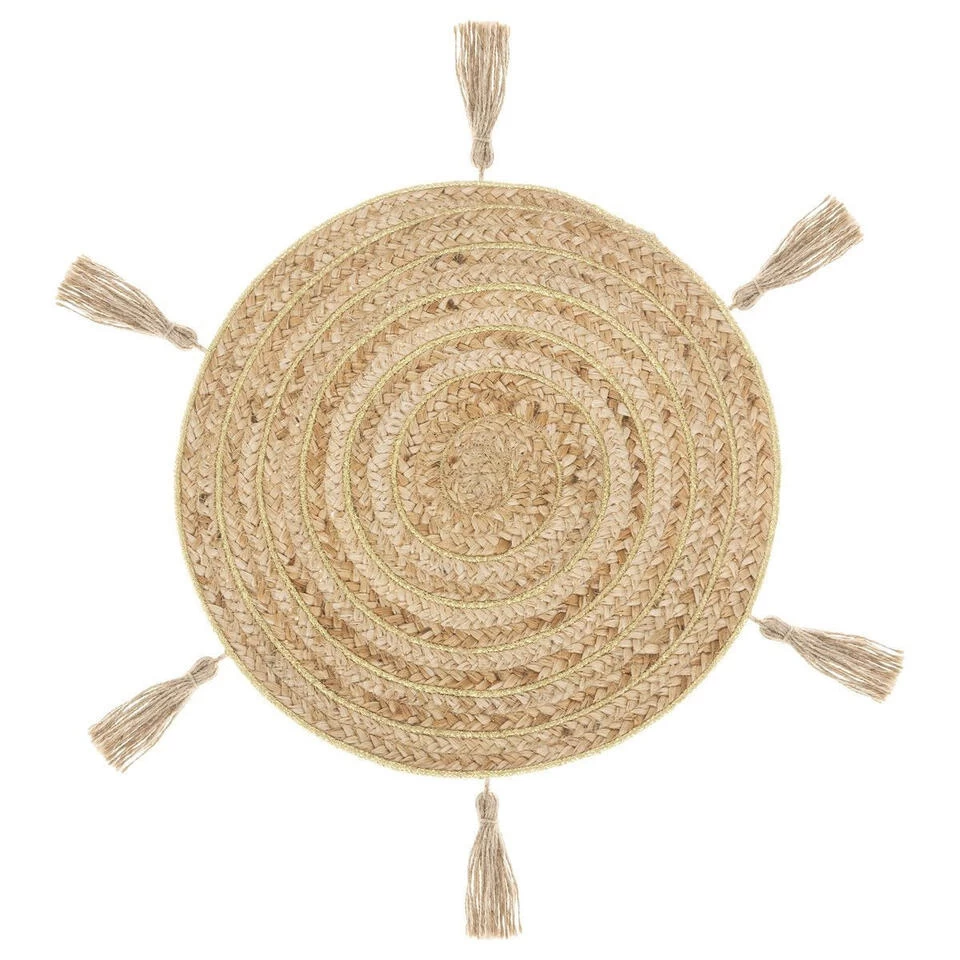 Ronde placemat raffia met franjes naturel 38 cm. Bescherm uw tafel tegen vlekken met deze stijlvolle placemats. Reinigen: Afnemen met een vochtige doek, eventueel afdrogen met een theedoek. Materiaal: jute/lurex. Tafel onderleggers – Tafeldecoratie.