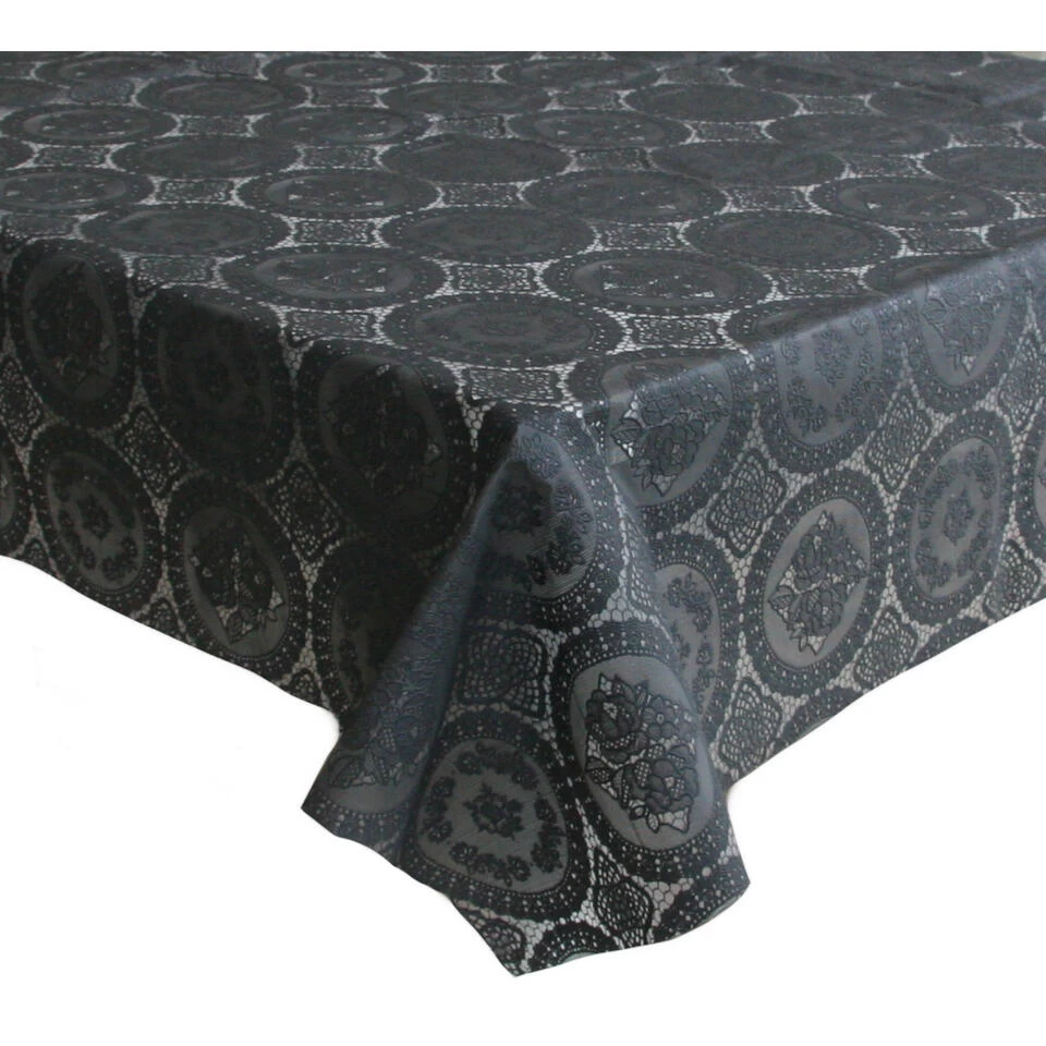 Tafeldecoratie zeil met voelbaar kanten patroon antraciet. Afmeting: ca. 140 x 220 cm. Het tafelzeil valt het mooiste rondom een tafel van 100 x 180 cm, zorg bij een grotere tafel voor een minimale overhang van 10 cm aan alle zijdes. Materiaal: PVC, vinyl. Enkel afnemen met een vochtige doek, geen schoonmaakmiddel gebruiken dit zal de print aantasten. Langdurige blootstelling aan diverse weersomstandigheden zal de print ook aantasten en/of doen verkleuren. Geschikt voor zowel binnen als buitenshuis.