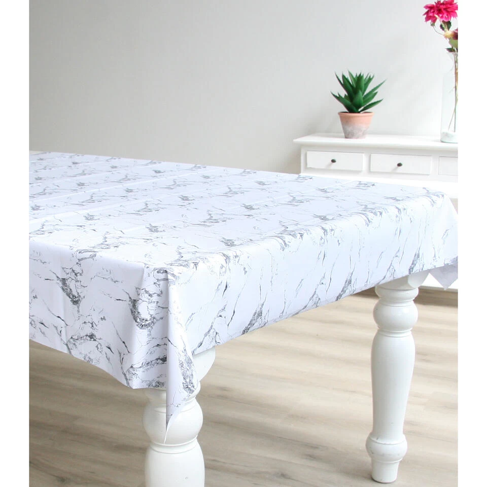 Tafeldecoratie zeil dat lijkt op marmer in het wit. Afmeting: 140 x 250 cm. Het tafelzeil valt het mooiste rondom een tafel van 100 x 210 cm, zorg bij een grotere tafel voor een minimale overhang van 10 cm aan alle zijdes. Materiaal: PVC met zachte non-woven vliesrug. 100% waterdicht en valt soepel rondom de tafel. Enkel afnemen met een vochtige doek, geen schoonmaakmiddel gebruiken dit zal de print aantasten. Langdurige blootstelling aan diverse weersomstandigheden zal de print ook aantasten en/of doen verkleuren. Geschikt voor zowel binnen als buitenshuis.