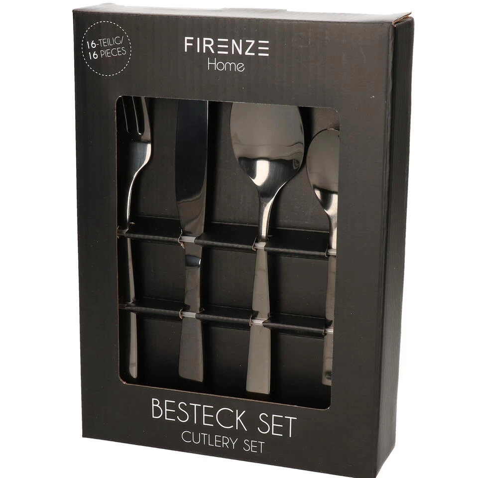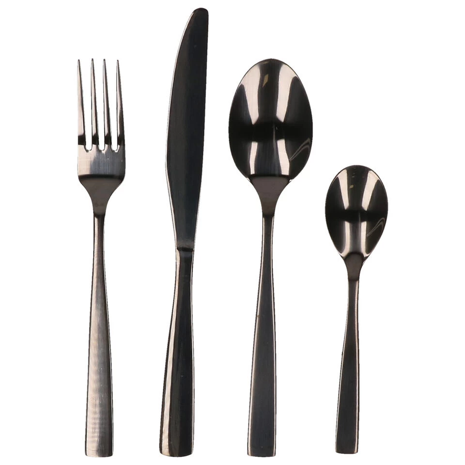Bestekset 16-delig mat zwart voor 4 personen. Deze 16-delige bestek set bestaat uit 4x vorken, 4x lepels, 4x messen en 4x theelepels en is geschikt voor 4 personen (4 couverts). Materiaal: RVS. Kleur: mat zwart. Vaatwasmachinebestendig: Nee, handafwas wordt aangeraden voor een langdurig behoud van de kleur.