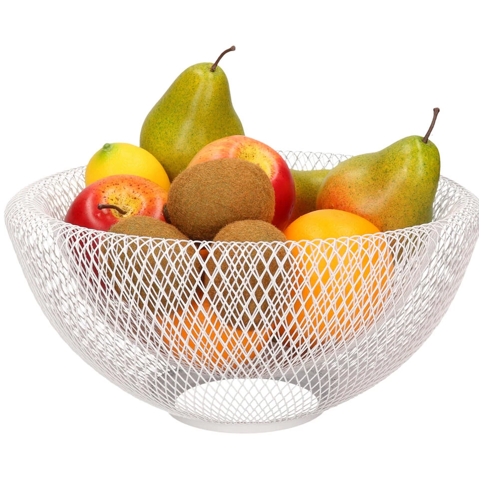 Metalen fruitmand/fruitschaal wit rond 31 x 15 cm. De open dubbele rand/wand zorgt voor een constante luchtcirculatie waardoor het fruit minder snel overrijp is. Materiaal: metaal. Reinigen: afnemen met een vochtige doek.