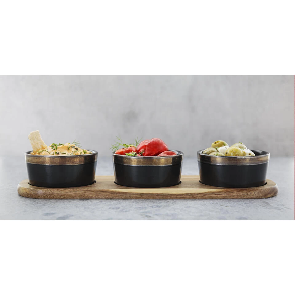 Serveerplank acacia 32 x 11 cm met 3x luxe hapjes/saus/tapas keramieken schaaltjes. De zwarte schaaltjes met gouden rand zijn ongeveer 11 cm breed en 5 cm hoog. Serveer uw gerechten met deze mooie set tijdens diner of borrel. Langwerpige serveerset.