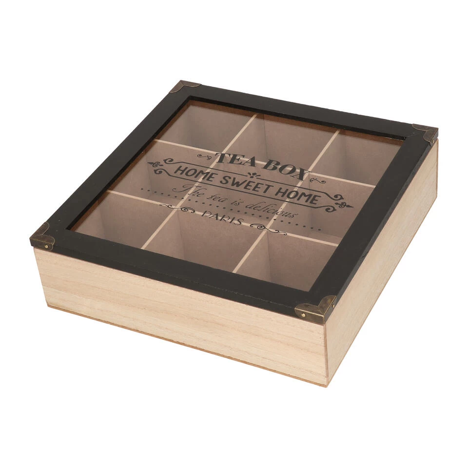 Houten theedoos/theekist bruin/zwart met mdf bodem met 9 vakken 24 x 24 x 7 cm. Vierkante 9-vaks theedoos voor het bewaren van diverse soorten thee/theezakjes. Met doorzichtig deksel met witte rand, metalen hoekbeslag en de teksten ‘Teabox’ en ‘Home Sweet Home’ op het glazen deksel.