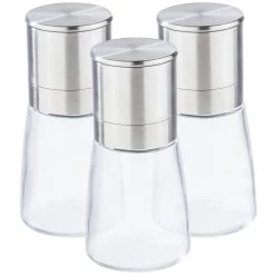 Set van 3x stuks kruidenmolen/pepermolen/zoutmolen RVS/glas transparant/zilver 13 cm. Geschikt voor het malen van diverse kruiden/specerijen, peper en zout. Je kunt het maalgraad aanpassen van fijn tot grof. Formaat: ca. diameter 6 cm x lengte 13 cm. Materiaal: RVS, glas.
