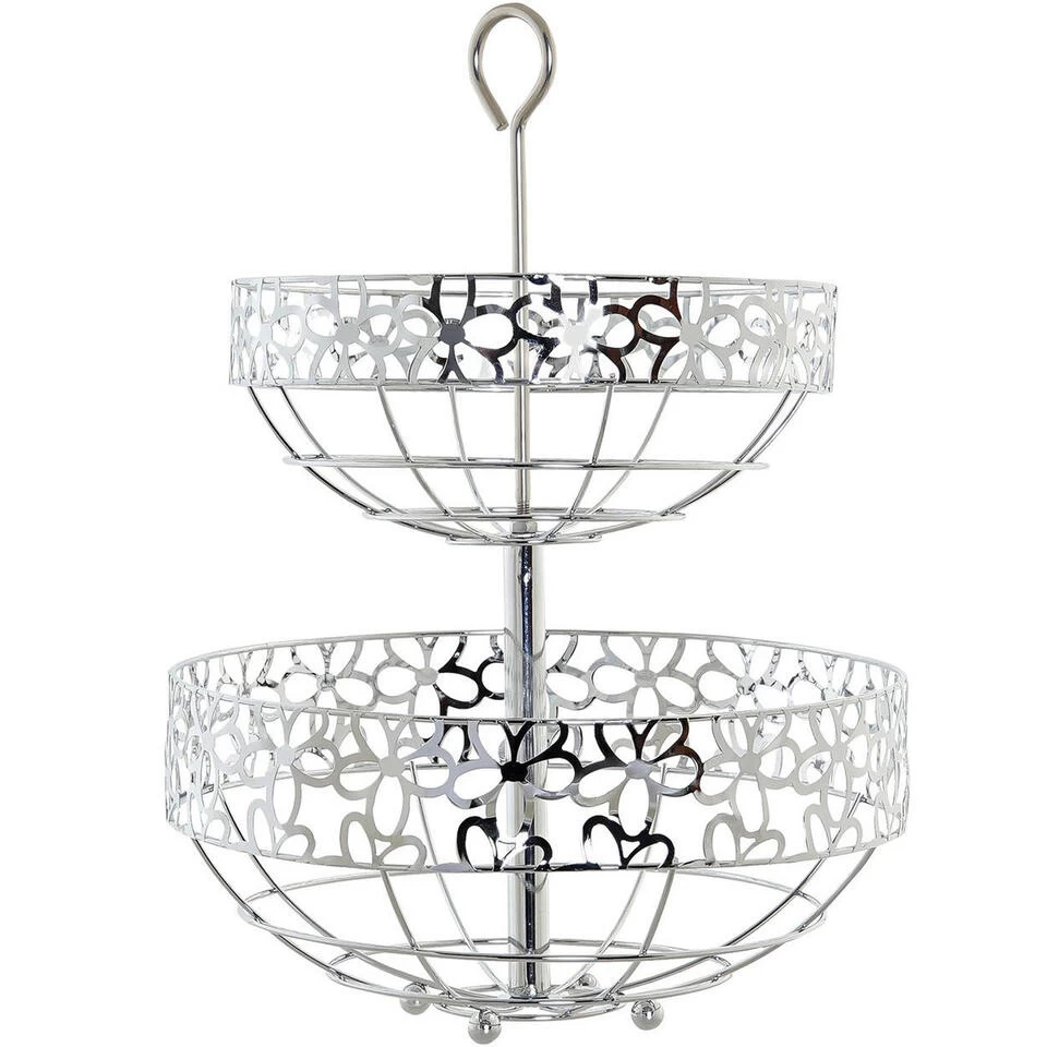 Een zilveren ronde 2-laagse fruitschaal/fruitmand, welke u makkelijk kunt verplaatsen door een vasthoudoog. De deels open rand/wand zorgt voor een constante luchtcirculatie waardoor het fruit minder snel overrijp is .Afmeting: ca. D28 x H39 cm, diameter is van de grootste schaal. Materiaal: verchroomd metaal. Reinigen: afnemen met een vochtige doek.
