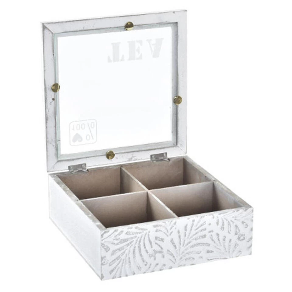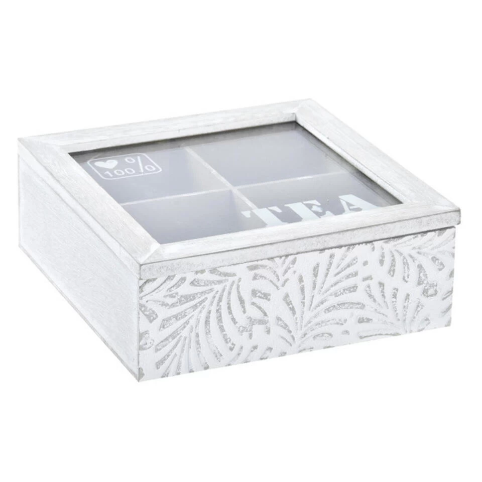 Theedoos/theekist model Leaves in de kleur wit met 4 vakken. Afmetingen: 19 x 19 x 7 cm. Materiaal: mdf hout en glas. Voor het netjes bewaren van diverse soorten thee/theezakjes. Met doorzichtige deksel. Decoratie print op de zijden. Standaard theezakjes passen rechtop in deze theedoos, groter verpakte zakjes kunnen vaak wel schuin in een vakje geplaatst worden.