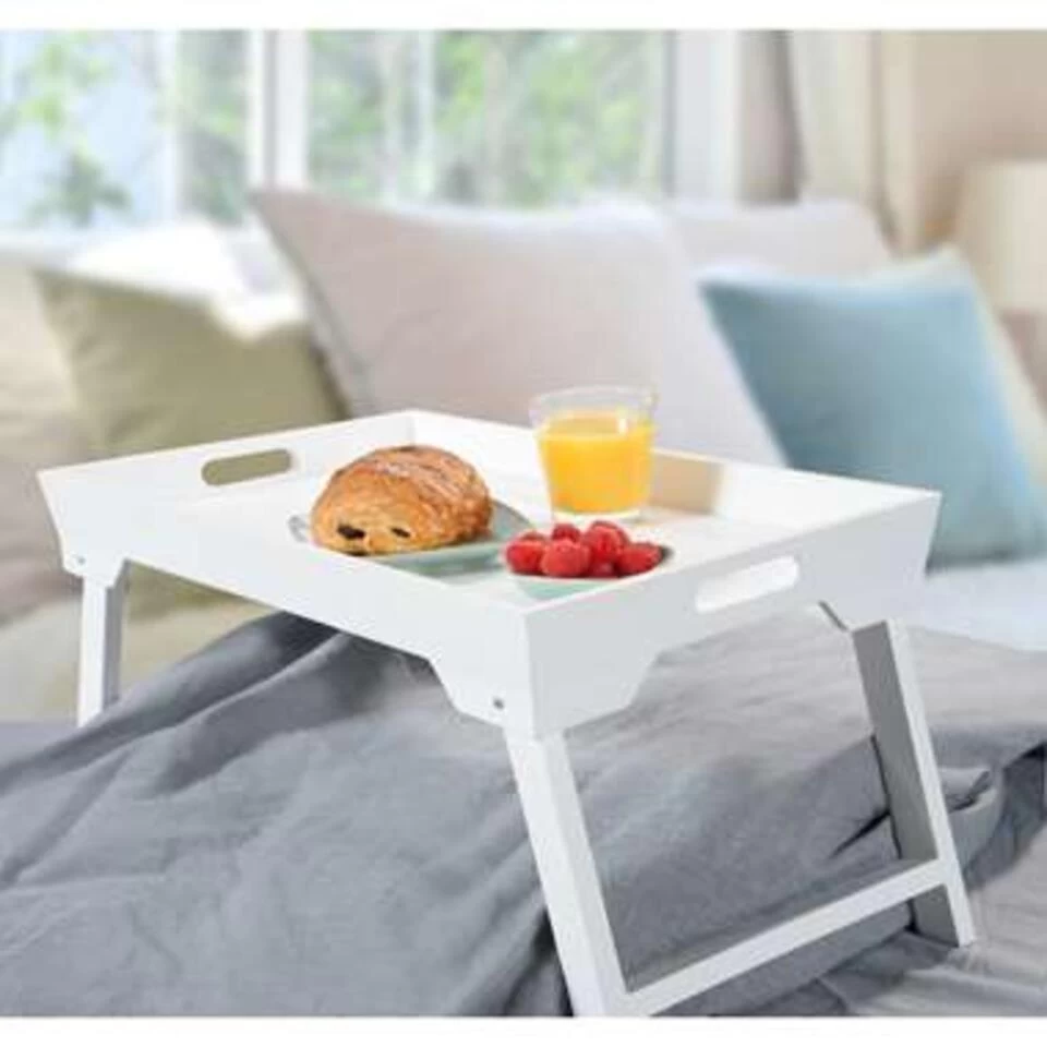 Wit houten dienblad 32 x 52 cm met inklapbare poten. Houten dienblad met een opstaande rand, waardoor het dienblad gemakkelijker vast te houden is en producten er minder snel vanaf glijden. Met uitklapbare pootjes, zodat u bijvoorbeeld een ontbijtje op bed kunt serveren. Ook geschikt om te gebruiken wanneer voor de TV eet, bijvoorbeeld op de bank of in uw stoel.
