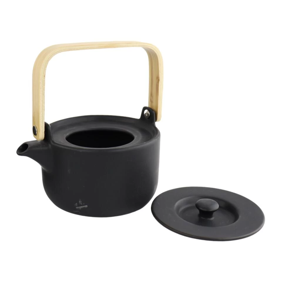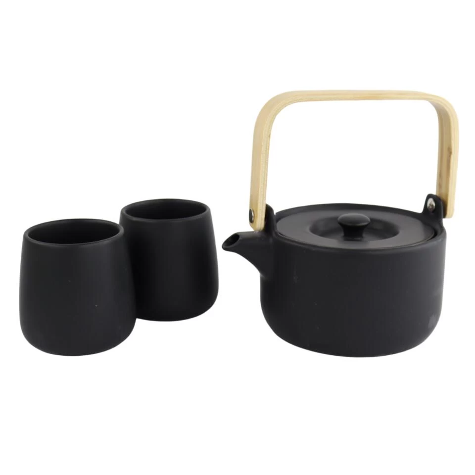 Orange85 Theepot Zwart Warmtehoudend 50cl Met 2 Kopjes Aardewerk Bamboe