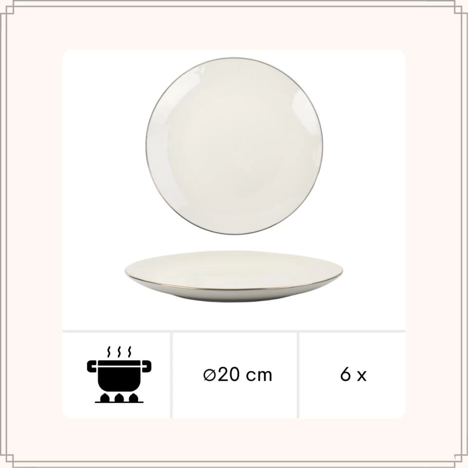 Porseleinen bordjes van OTIX. De borden zijn wit en hebben een gouden rand. De set bestaat uit 6 bordjes. De borden zijn geschikt als gebaksbordjes en hebben een diameter van 20 cm. Geschikt voor in de vaatwasser.