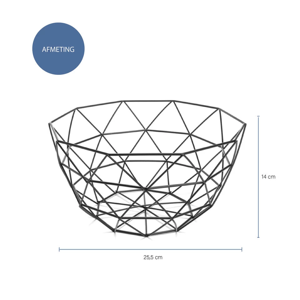De QUVIO fruitschaal diamantvorm is het ideale woonaccessoire om uw fruit in neer te leggen. De mooie fruitschaal is gemaakt van metaal. De schaal is verkrijgbaar in het zwart. Natuurlijk kan je de fruitschaal voor meerdere doeleinden gebruiken. De fruitschaal heeft het tijdloze uiterlijk van een diamant waardoor hij in ieder interieur mooi tot uiting komt. Dit maakt de fruitschaal ideaal voor elke woonruimte. Je kan de schaal eerst een periode in de keuken zetten,waarna je deze een periode op een andere plaats in huis zet bijvoorbeeld in de woonkamer of hal. Door het speciale ontwerp van de schaal kan het fruit sneller rijpen,omdat het op deze manier meer zon kan vangen dan dat de afwerking van de schaal helemaal dicht zou zijn.