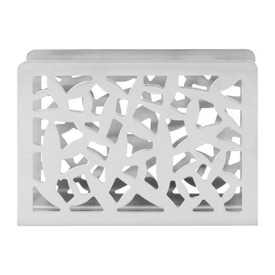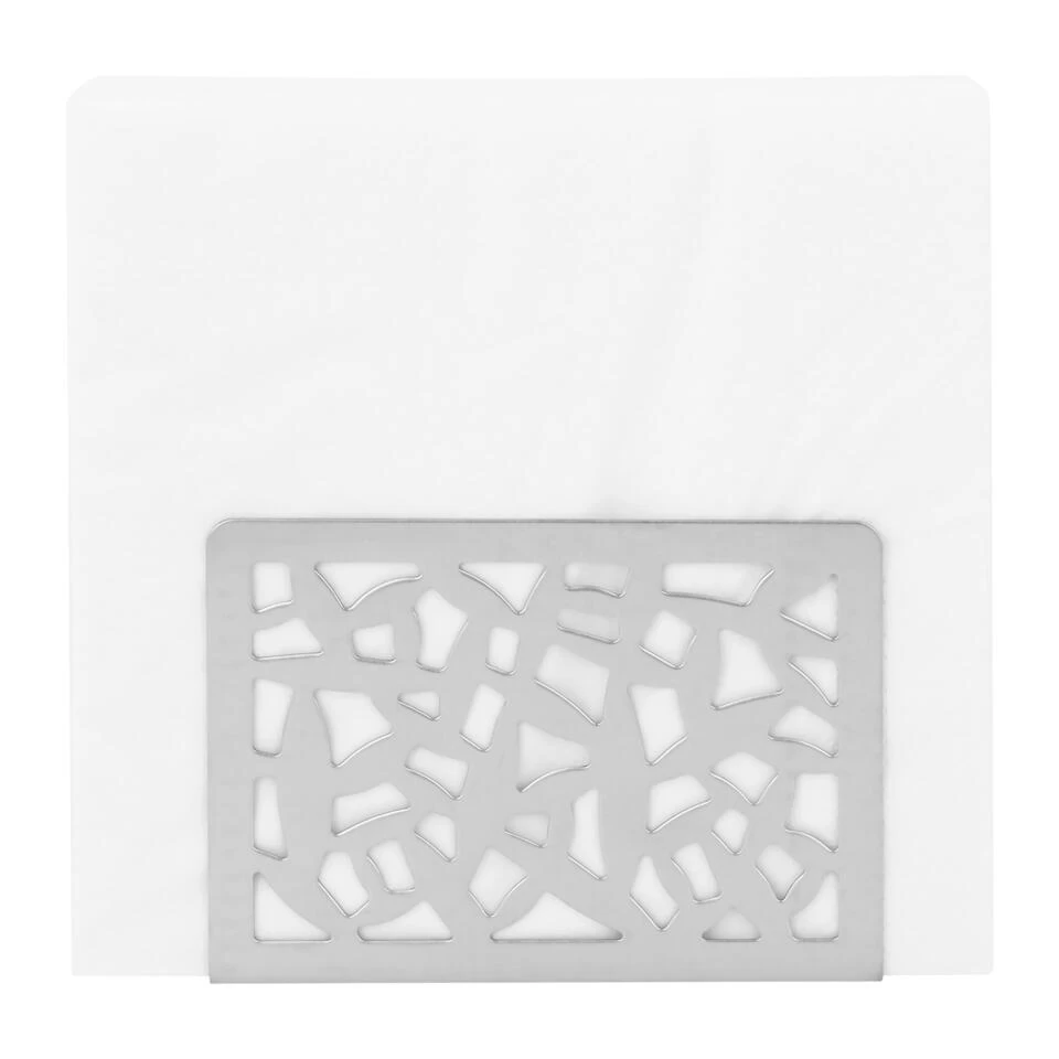 De servettenhouder is rechthoekig en heeft de kleur zilver. De servethouder gemaakt van rvs heeft uitsparing aan de zijkanten in een abstract patroon. Je ziet de servetten dus deels door de houder heen en het patroon zorgt ervoor dat deze servet accessoires er aantrekkelijk uitzien.