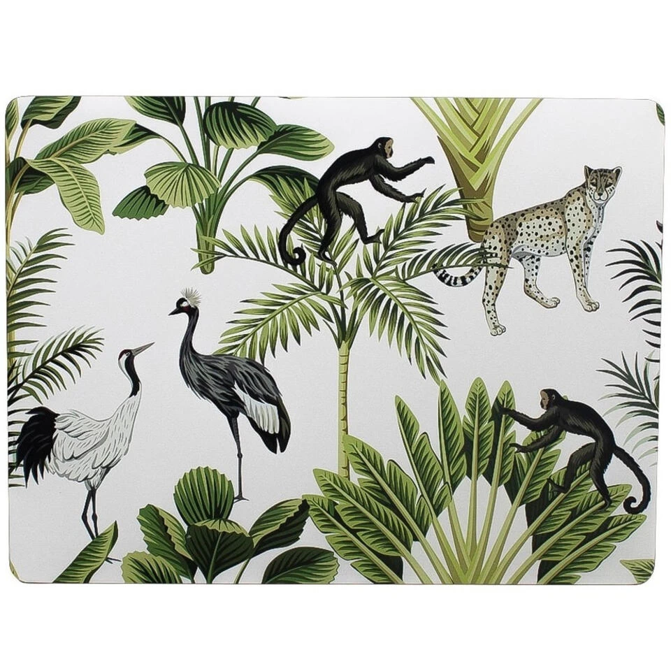 Rechthoekige placemat jungle print wit. Afmeting: 30 x 40 x 0.4 cm. Materiaal: kurk, mdf. Makkelijk af te nemen met een licht vochtige doek.