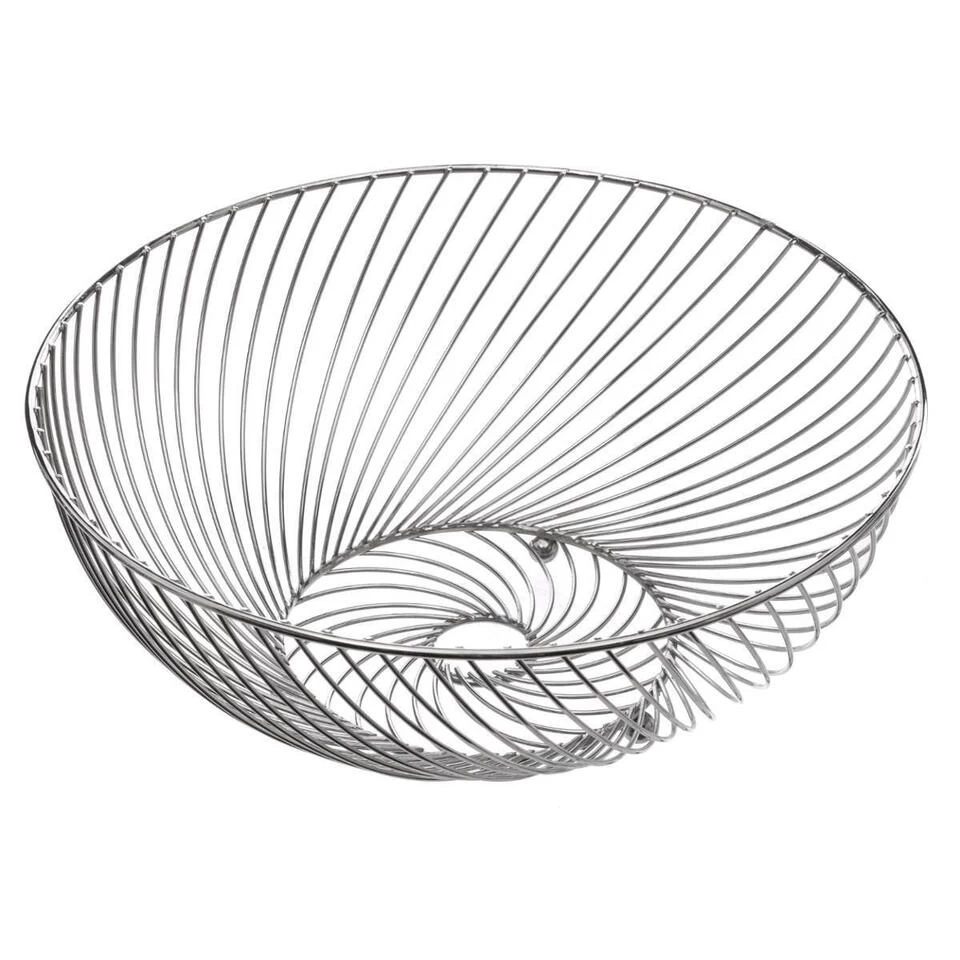Fruitschaal/fruitmand rond zilver metaal 30 cm. De opengewerkte schaal zorgt voor een constante luchtcirculatie waardoor het fruit minder snel overrijp is. Afmeting: ca. D30 x H12 cm. Reinigen: afnemen met een vochtige doek. Fruitschalen/fruitmanden/draadmanden.