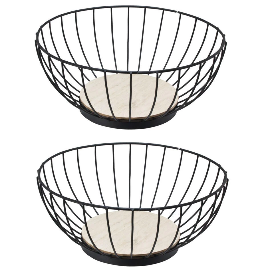 Metalen fruitmand/fruitschaal zwart rond 28 cm. De opengewerkte rand/wand zorgt voor een constante luchtcirculatie waardoor het fruit minder snel overrijp is. Materiaal: staal/hout. Reinigen: afnemen met een vochtige doek.