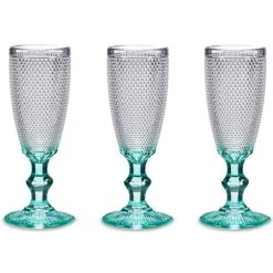 Luxe Monaco serie Cava of Champagneglazen set van 6x stuks op turquoise blauw gekleurde voet 180 ml. Prachtige luxe uitstraling glazen collectie van Vivalto. De voet is blauw gekleurd in het glaswerk, de bovenzijde is transparant. Formaat per glas 6.5 x 20 cm. Gemaakt van glas met schitterend relief in de glazen.