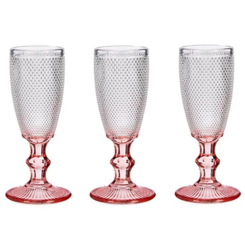 Luxe Monaco serie Cava of Champagneglazen set van 6x stuks op roze gekleurde voet 180 ml. Prachtige luxe uitstraling glazen collectie van Vivalto. De voet is roze gekleurd in het glaswerk, de bovenzijde is transparant. Formaat per glas 6.5 x 20 cm. Gemaakt van glas met schitterend relief in de glazen.