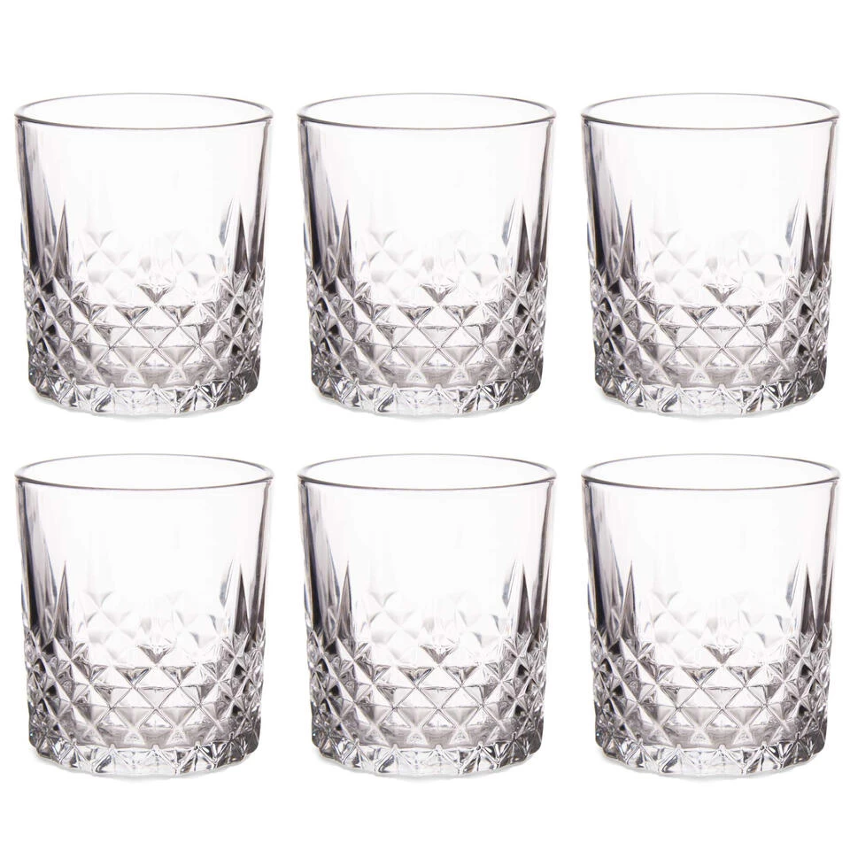 Set van 6x whisky tumbler glazen met een uniek bewerkt glas patroon in de Dandy serie. Afmeting: 8 x 9 cm. Inhoud: ca. 310 ml/31 cl. Materiaal: glas. Reinigen: vaatwasser geschikt. Stijlvolle whisky/whiskey glazen voor jezelf, om als cadeau te geven voor bijvoorbeeld een verjaardag of Vaderdag. Merk: Vivalto.