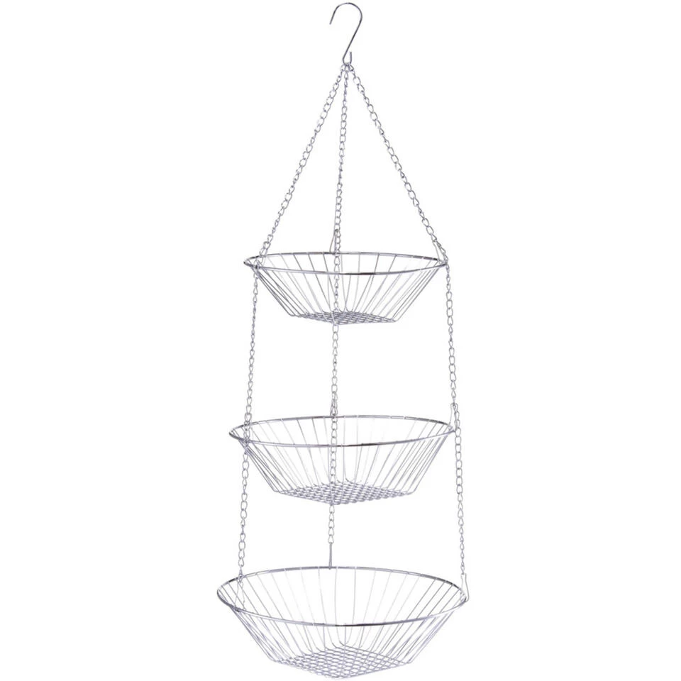 Een zilveren ronde 3-laagse fruitschaal/fruitmand, welke u kunt ophangen aan bijv. het plafond of tentbuizen. De deels open rand/wand zorgt voor een constante luchtcirculatie waardoor het fruit minder snel overrijp is.